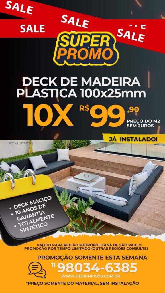 Produzido com plástico reciclado, o Deck de Madeira Plástica promove a reutilização de recursos, contribuindo para a preservação ambiental. Escolher esse tipo de deck é optar por uma solução sustentável e duradoura, perfeita para quem valoriza o meio ambiente sem abrir mão do design e da qualidade.